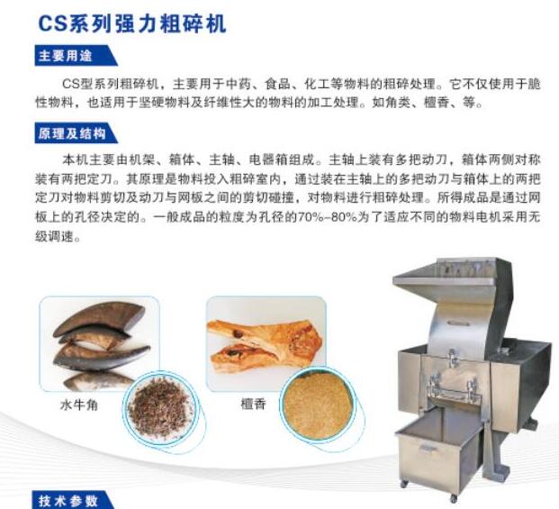 該機是中藥破碎的理想設備,其破碎的物料可作為提取、出口的中藥顆粒、粉碎細料用。破碎的物料出粉率低。尤其適用于中藥中堅硬、難粉的物料。如堅硬的根類、藤類,各種角類的粗碎加工。